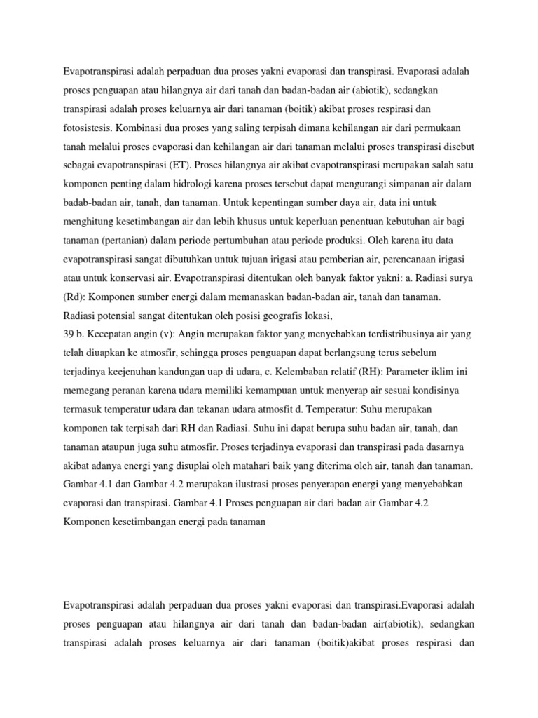 1 bab ii pembahasan 2.1 definisi evaporasi evaporasi adalah salah satu komponen siklus hidrologi, yaitu peristiwa menguapnya air dari permukaan air, tanah, dan bentuk permukaan bukan. Evapotranspirasi adalah gabungan evaporasi dan transpirasi tumbuhan yang hidup di permukaan bumi. Evaporasi adalah proses penguapan atau hilangnya air dari tanah dan. Kondensasi adalah perubahan wujud benda ke wujud. Dalam kebanyakan proses evaporasi, pelarutnya adalah air.