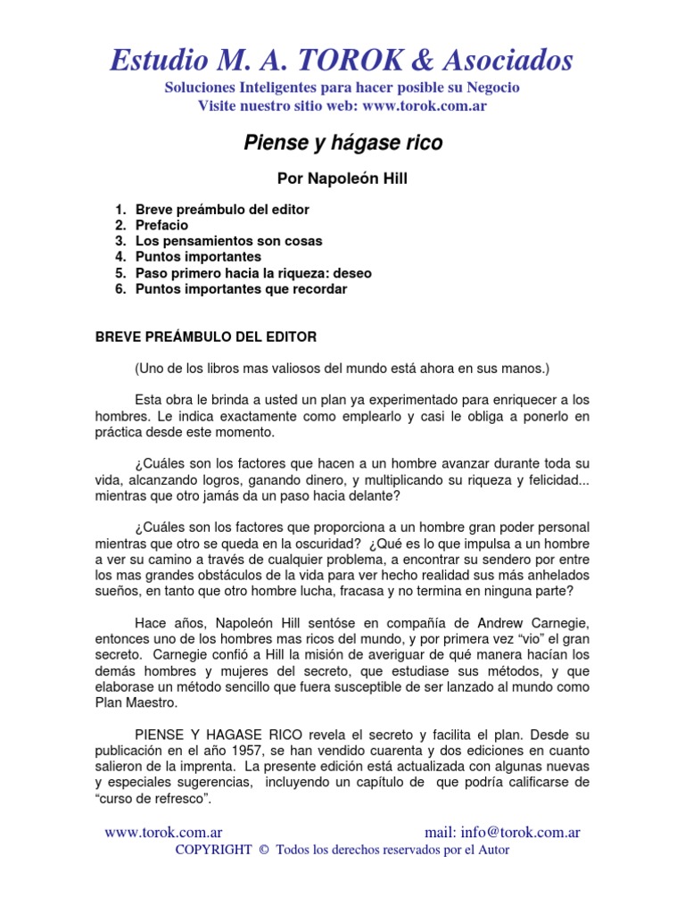 Think and grow rich traducido de la edición de fawcett crest edition, usa, 1985 ó 1990, napoleon hill tercera reimpresión, diciembre 1996 digitalizador: Piense y hagase rico pdf gratis continue cada capítulo de este libro, que ha hecho una fortuna para cientos de personas extremadamente ricas, a quienes he analizado exhaustivamente a lo largo de los años, discute el secreto de cómo ganar dinero. Piense y hágase rico es un libro que contiene el secreto más importante de andrew carnegie, el mentor de napoleón hill y de cientos de millonarios de su época. Descargar piense y hágase rico pdf gratis. La riqueza y la realización.